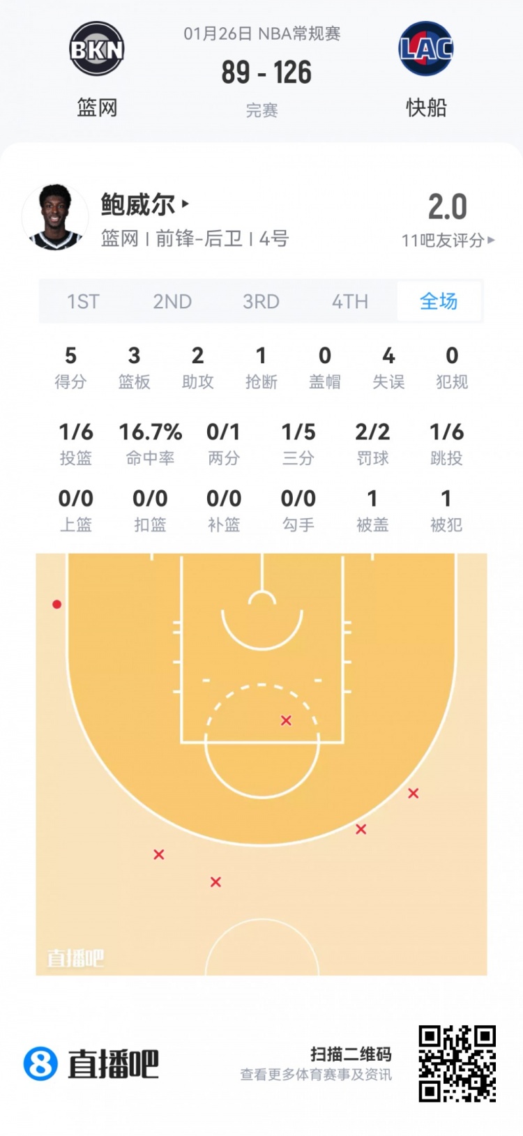 快船次轮50号秀科比·桑德斯 登场30.3分钟